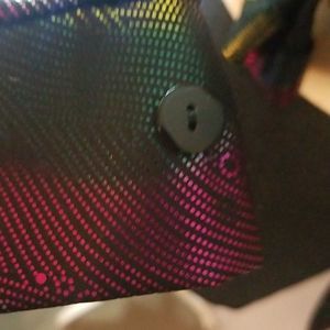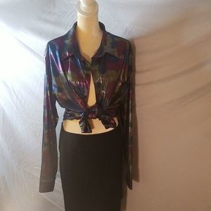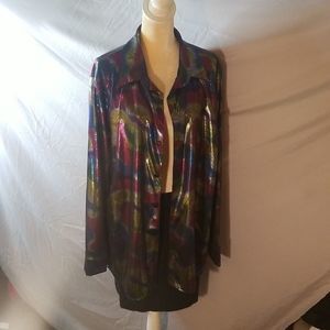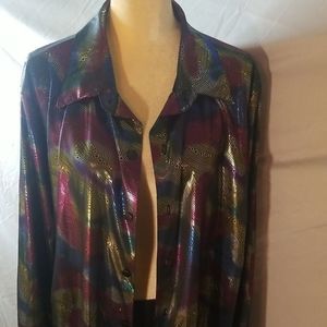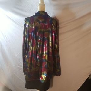 Absolutely stunning rare shirt in a metallic multicolored geo swirl pattern in purples, gold, silver, green, Fuschia & black. This item can be worn in so many ways especially for women, wear as mini dress with tights, pair with leggings and metallic boots, wear open with Jean's and heels, wear as shacket, put a belt with it and wear oversized ladies, endless options for a lux, glam, chic, runway look. Men wear as a costume. This is a Unisex item and Measures approximately 24" pit to pit, 22" waist, 19.5" shoulders, 25" sleeves, and 33" long, size not listed these measurements are extremely close to accurate. Mens XXL & Womens 2X. View all photos as they are apart of description and contain significant information. Pristine condition.