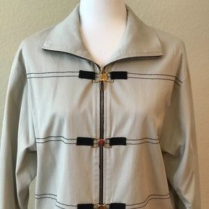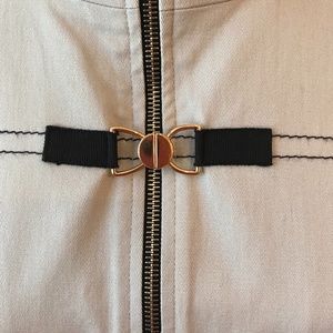 Cute and sporty trench style short khaki-colored coat by St. John. This light weight coat is ideal for the work week or casual weekends. Black accents, gold tone interlocking button closures and zip front. Pretty button cuffs. Fabric is cotton. Never worn.