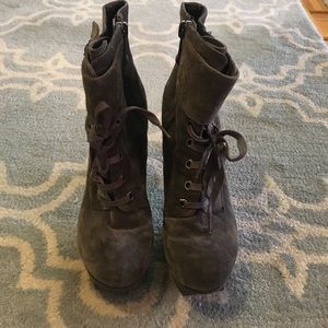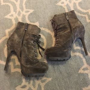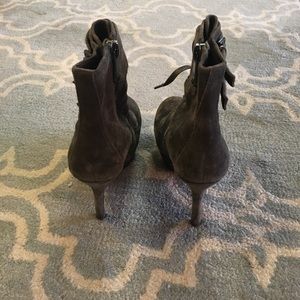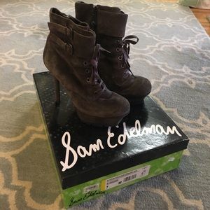 Sam Edelman lace-up suede "Vancouver" bootie in "Graphite" gray color. Suede with rubber sole and 5" heels. Zip side closure. Comes with box.
