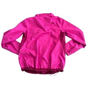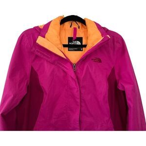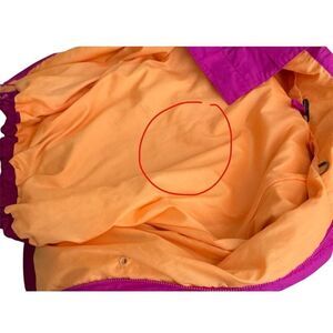 The North Face raspberry, orange sherbet and maroon ski jacket. Removable hood, cinch ties throughout, zipper and velcro closure. Spot inside jacket. Excellent preowned condition. Size M