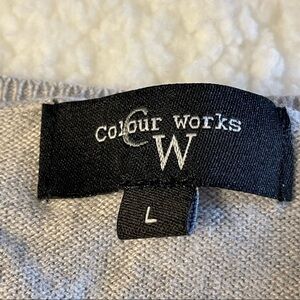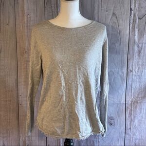 This top is in good condition with little signs of wear. It is 53% cotton, 40% rayon and 7% nylon. This is a hand wash item. It is like a lightweight sweatshirt with long sleeves and decorative fringe at the bottom. Great for a casual outing or dress it up for the office with a pair of slacks.