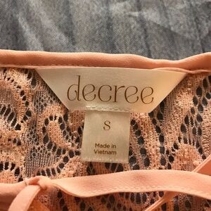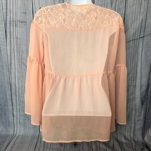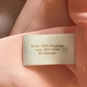 This top is in good condition with normal signs of wear. It has a tie front and is sheer. The body is 100% polyester and the lace is 92% nylon and 8% spandex. It is a light peach color.