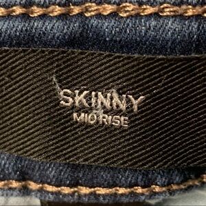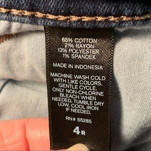 These jeans are in good condition with normal signs of wear. They are 65% cotton, 21% rayon, 13% polyester and 1% spandex. They are machine washable and a medium wash jean and a mid rise jean. Great looking pair of jeans.