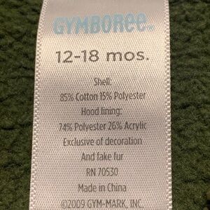 This jacket is in good condition with normal signs of wear. These sizes don’t get much wear before the kids are out of them! The shell is 85% cotton and 15% polyester and the hood lining is 74% cotton and 26% acrylic. It machine washable. Great jacket for those kids that are outgrowing everything and can be used for all seasons!