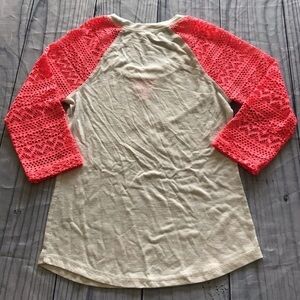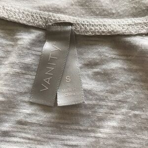 This top is in good condition with normal signs of wear. The body is 65% polyester and 35% rayon and the sleeves are 97% polyester and 3% spandex. Great shirt for everyday.