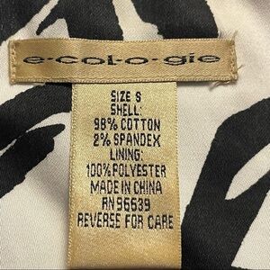 This jacket is in good condition with normal signs of wear. It has been in storage so may need to be dry cleaned again before wearing. The shell is 98% cotton and 2% spandex and the lining is 100% polyester. It is dry clean only item. It is two button front and king sleeve jacket. It is a short, cropped style and is black and white. Great jacket with a camisole and a pair of jeans or dress pants and a day at the office.
