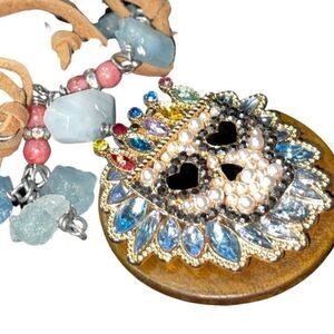 Sugar skull, crystal pendant, wooden foundation pendant on hand-wire wrapped rough nugget aquamarine beads, accented with pink rhodonite & Swarovski crystals and medium faceted aquamarine, approx 16” with leather tie closure and 3 1/2” drop.