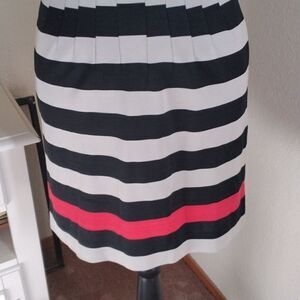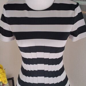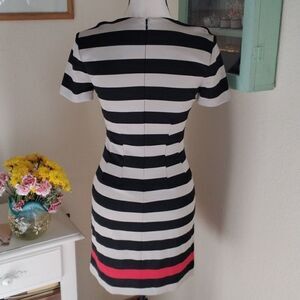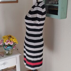 The seams on the dress create a beautiful silhouette that is fitted at the bodice with tucks and a curved seam under chest, so flattering! Silky knit fabric. Light gray and black stripes. Border print of red. Perfectly matched stripes. Back zip. Short sleeves. Size 2 measures 32 at chest, 26 at waist, 35 at hips. 32.5 long from shoulder to hem. This one is fun, well made, and super comfortable.
