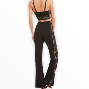 Gorgeous set featuring a cropped top and high-rise pants with stunning floral lace accents.