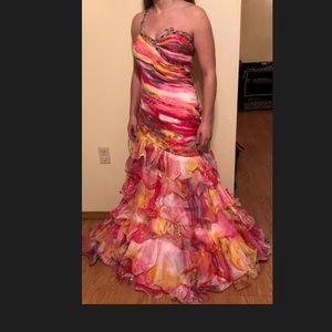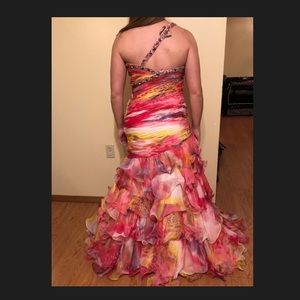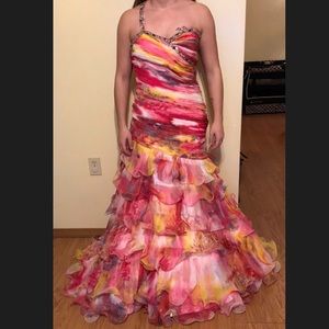 MORRELL MAXIE DRESS Great colors for the 2018 prom season, this multi color princess feel dress has 1 strap with beads and beads along the bust area.
