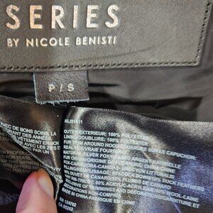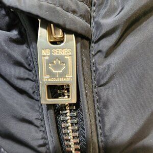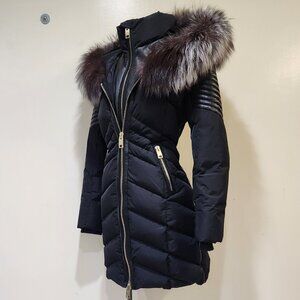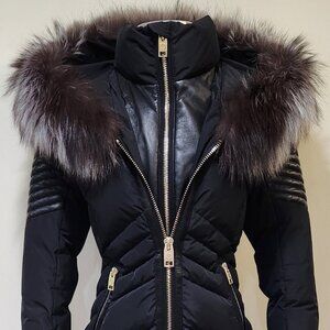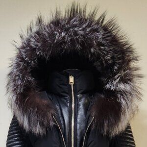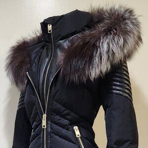 RARE FIND! Must-have, an absolutely stunning quilted puffer from iconic Nicole Benisti known for amazing quality outerwear. It comes in Black with very rare Ombre Black & Silver Fox Fur. Exclusively from NB Series Collection. This timeless showstopper offers everything: incomparable comfort, warmth, and a bold fashion statement! Arctic Rated: Down to -30°C. It is made with outstanding quality materials.Shell: 100% Polyester. Trim: dyed lamb shearling (from New Zealand). Fill: 90% Duck Down, 10% Feathers. Cuffs: 60% Acrylic, 40% Wool. Designed with a long-lined fitted silhouette, windproof quilted shell, moto-style ribbed leather panels front asymmetrical dual zipper closure, uniquely practical inner bib, funnel neck, 100% Black genuine leather trim, multilayer system for extra warmth, interior ribbed thumb hole cuffs, GORGEOUS signature Nicole Benisti hood trimmed with luxurious Silver Fox Fur fur to protect the face, additional inside zippered pocket, large heavyweight sturdy gold tone hardware with N.B. logo, and black leather N.B. logo on the back. This coat is an investment piece that will last a lifetime! Size S. Approx measurements flat: Armpit to Armpit 19", Waist 18", Shoulder to shoulder 16.5", Sleeves 25.5", Length 34". RN #154792. NWOT from a clean, smoke-free home.