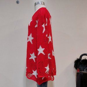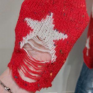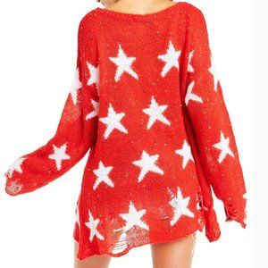 THE iconic sweater that put Wildfox on the map! An effortlessly cool, bold, and edgy-chic peace. Blogger's favorite, it has been worn by many celebrities. It is one of those hot timeless fashion pieces that are easy to throw over anything and look ultra stylish on any occasion! Comes in bold vibrant Red with a white star pattern and super cute multicolor speckles. Designed with a scoop neckline, Intentionally loose-knit lightweight texture, distressed, ripped detailing at the sleeves and the bottom for a vintage appearance, and a super comfy relaxed fit. Crafted from 70% acrylic, and 30% Polyester. It looks amazing styled with any outfit! Size Small. Approx measurements flat: Pit to pit 24", Sleeve 20.5", Length 26". NWOT condition from a clean, smoke-free home.