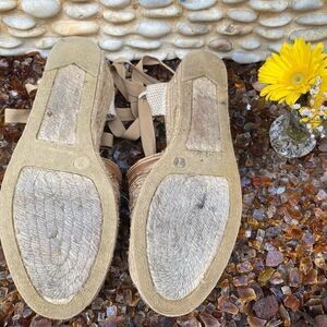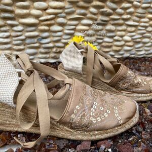 HOT KISS SPARKLY GOLD WEDGE HEEL ESPADRILLES Sz 7 with wrap around tie straps. Gently loved pre-owned condition but lots of life left. Perfect to dress up any summer outfit. Ships from a smoke and pet free home.