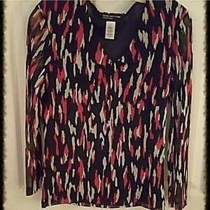 LOVE this colorful top!💖Bought it to go w/ a pink jacket but it didn't match so it's been hanging for awhile.🖤 Gathering at V neck mimics a bow.💖 Measures 24" from shoulder to bottom. Measures 17" from V to bottom. Flirty, feminine & sassy!🖤 Sleeves are semi-sheer while the body is lined. NWOT.💖