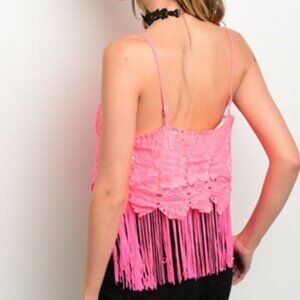♥️Price is FIRM ♥️ NO OFFERS ♥️BRAND NEW♥️ Hot pink crochet top with fringe trimming around the bottom and a relaxed fit! adjustable straps 100% polyester