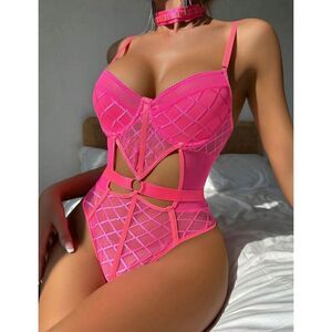 HOT PINK ring linked cut out mesh underwire teddy bodysuit with choker lingerie