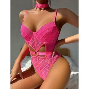 HOT PINK ring linked cut out mesh underwire teddy bodysuit with choker lingerie SIZE MEDIUM
