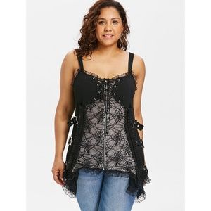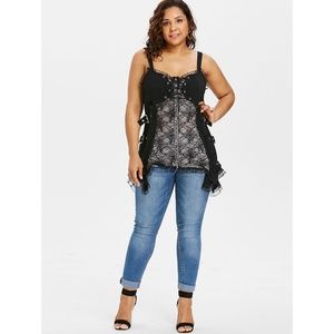 Crossover lacing and a flouncy edge add boudoir-style drama to this Queen-Anne neckline tank top fashioned with a cool lace spider web pattern and bustier empire waistline for a gothic touch. This is easily my personal favorite!