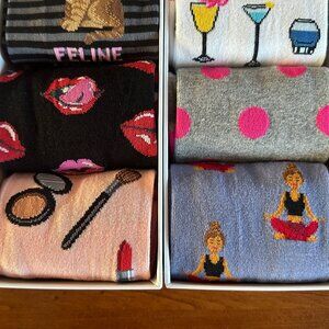 HOT SOX WOMEN'S 3-PACK GIFT BOX SET:NIB CAT/MAKE-UP/LIPS or YOGA/COCKTAILS/DOTS