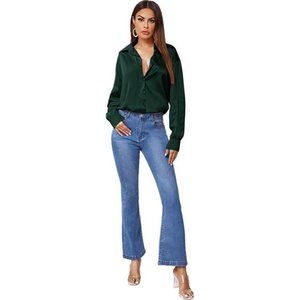 HOT Satin Silk Long Sleeve Blouse Button Down Shirt Casual Top, Green