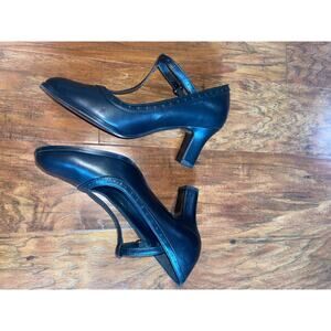 Need a classic shoe to finish off your look? A black T-strap heel is what you need! These fitted heels have a dotted trim and adjustable buckle that secures around the top of the foot.