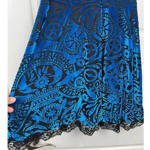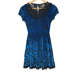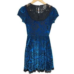 Skater Dress from Hot Topics limited edition partnership line for Miss Peregrine's Home for Peculiar Children. No longer being sold in stores or online. Beautiful jewel toned blue velvet over black fabric. Skater style dress. Lace detail around neck on both front and back, and along hemline.