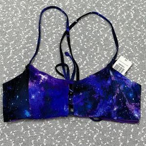The reversible halter tie-back design is purple on one side, and a galaxy on the other