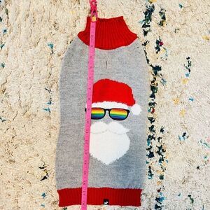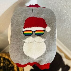 Get your pup in the holiday spirit with this Pride-themed dog sweater featuring a sunglasses-wearing Santa Claus.