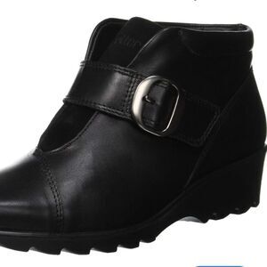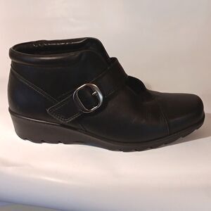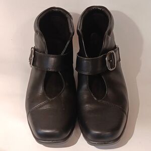 Step out in style with these sleek black leather ankle boots. Padded at ankle, and footbed. Strap with buckle close with Velcro. Treaded sole. Perfect for any occasion, they offer both comfort and elegance. Size 9.5. measures 11 long, 3.5 wide. Like NEW condition.