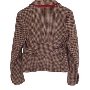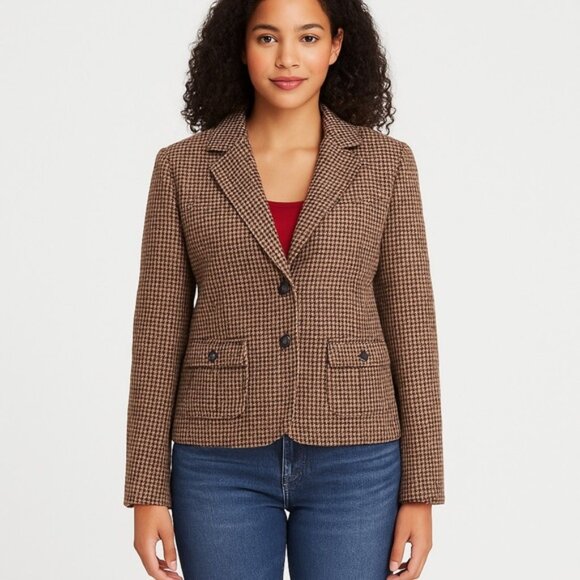 Item keywords: Vintage American Eagle, Y2K Preppy Blazer, Tailored Wool Jacket, Brown Ecru Houndstooth, Red Lining, Structured Fit, Classic Heritage Style, Modern Denim Style, Smart Casual, New Preppy, Normcore, Elevated Basics, Retro Heritage-Inspired, Capsule Wardrobe, Everyday Luxury, Office Siren, Chic Classy, Statement Layer, Polished Wool Blazer, Fall Fashion Essential