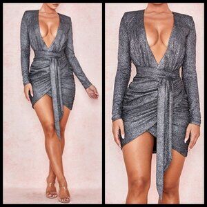 💕HOUSE OF CB💕 Annukka Graphite Sparkle Wrap Dress ~ Metallic Silver XS NWOT