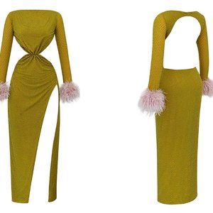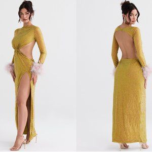 HOUSE OF CB 'Gina' Feathered Chartreuse Crystallised Maxi Dress NWOT