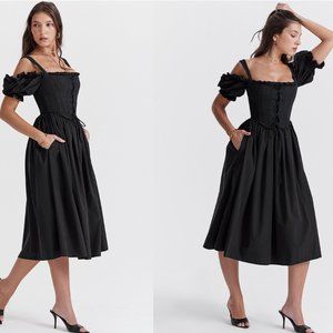 This dress is stunning!! Made from stretch black cotton for a breezy fit, it has a shirred bodice that peaks through the beautifully designed lace up broderie anglaise corset that 'Silvana' can be worn with or without depending on your vibe.