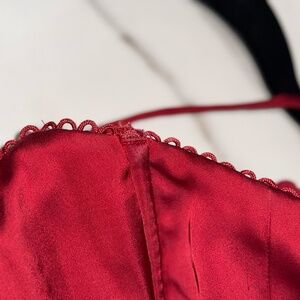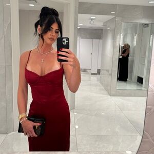 This HOUSE OF CB gown is absolutely beautiful! Perfect for the Holidays coming up! Only worn one time, slight stain (as shown on picture) from deodorant. I did get the waist taken in a little bit from the tailor for better fit. Size Large A/C-cup, Blood Red.