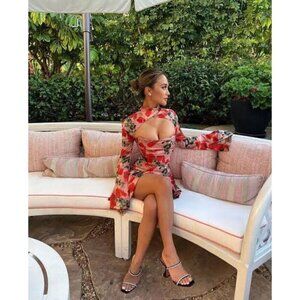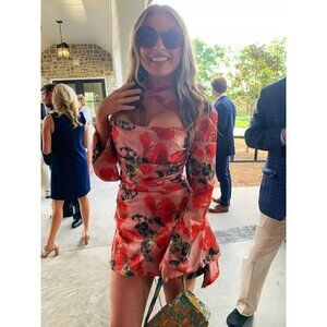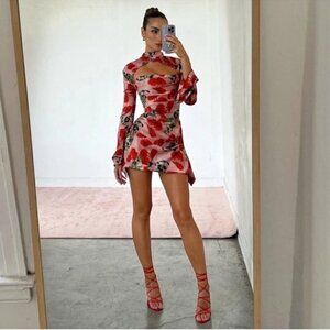 HOUSE OF CB Toira Long Sleeve Satin Corset Minidress in Rose Print Size Small