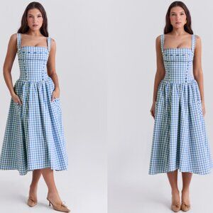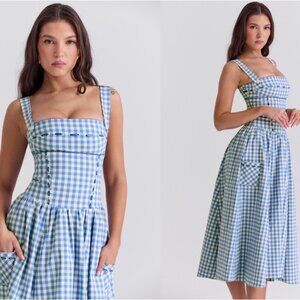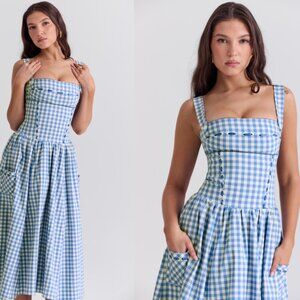 HOUSE OF CB 'Vivien' Regatta Blue Gingham Midi Sundress NWOT