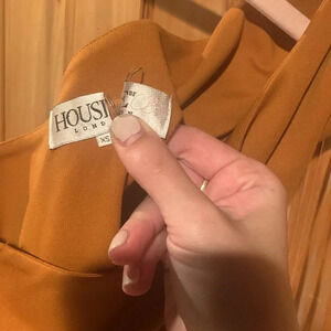 House of CB Raza jumpsuit. In great condition overall with a few small callouts. Two small white spots, one on the back hip and one by size zipper. Small discoloration on shoulder and some discoloration by ankles. These are not very noticeable and could likely be washed out. Has stretch. Price reflecting the condition. This is currently retailing at $179. Stock photos added for reference from the website.
