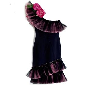 Stunning vintage (ca. 1990‘s) House Of Field black mini power stretch one shoulder dress with large flowers and rush front detail adorned with a voluminous raw layers of asymmetrical tulle detail. Very good vintage condition.