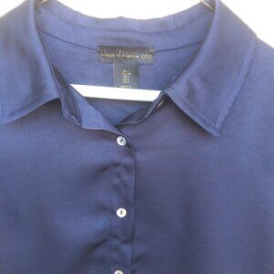 HOUSE OF HARLOW 1960 | NWOT Navy Blue Satin Boxy Adjustable Drawstring Side Bow Tie Hem Button Up Crop Top L