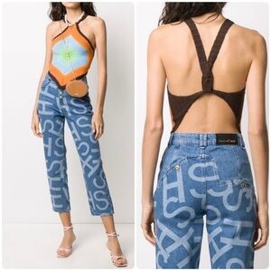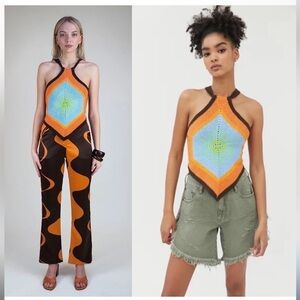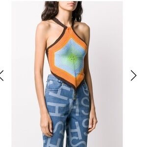 Soft knit top from House Of Sunny in a halter silhouette. Cut slim with a high neckline and handkerchief hem. Topped with a bold design at the front and ribbed trims along the edges and shoulder straps that gather at the open back!