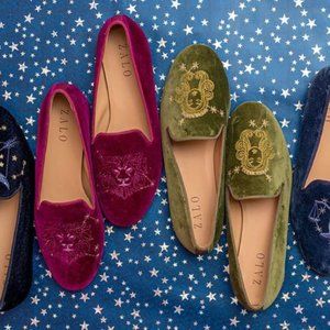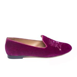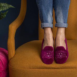 Our Leo slipper features rich fuchsia Italian Cotton-Velvet with matching grosgrain trim and our Zodiac themed Leo embroidery.