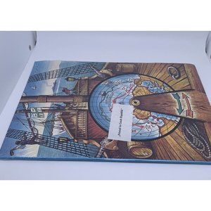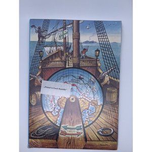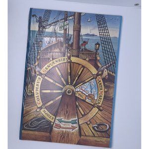 4to, 8 pp. Illustrated by Voitech Kubasta. Full color illustrated cover of the deck of the Santa Maria with moveable ship's wheel, which exposes different parts of a map of Columbus' voyages as it turns. Inside back cover folds out to reveal a pop up diorama with three dimensional pop ups of Columbus' three vessels at anchor in a central American harbor. Strings are threaded through the Santa Maria to give the effect of the rigging. There is a small paper tape repair on the back of the hinge at the very front of the diorama where two small boats pop up. The verso of this fold out is lavishly illustrated with a portrait of Columbus, a portrait of King Ferdinand and Queen Isabella, a scene depicting Columbus' landing in the new world and the coat of arms of Columbus. Kubasta is the well known Czech children's book designer and illustrator, who trained as an architect, and worked with the state run Artia, in Prague.