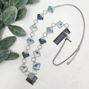 Long silver tone necklace with blue squares with rhinestone accents. There are some squares that are only silver tone, some dark blue and some light blue. It is approximately 36" long with a lobster clasp finish and 2.5" extender. It is new with tags. Please see all photos as this is the exact item you will receive. Thank you so much for looking. I am always open to reasonable offers. Have a fantastic day!