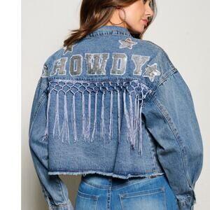 Embrace Southwestern style with this stunning blue denim jacket, adorned with sparkling sequins that spell out "HOWDY" and playful fringe details that perfectly capture that irresistible western charm!