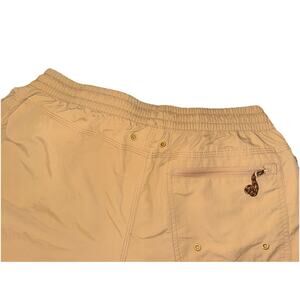USA MADE. Small hole in pocket. These gently love Howler Brothers Salado Shorts are a stylish and versatile option for men in size small. These 7-inch shorts feature a solid beige color with a drawstring closure, making them suitable for outdoor activities or everyday wear. The chino style and regular fit ensure comfort and sophistication, making these shorts a great addition to any man's wardrobe.