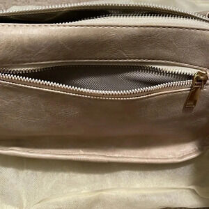 Bag is more like first photo in person maybe slightly lighter! Creamy/beige like color! Can be darker or lighter depending on the lighting.