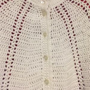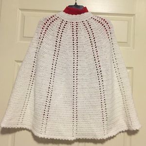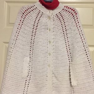 Hand knitted cape features button front. Fantastic detail and condition. Shown with red shirt for effect, looks great with everything. 26" long.