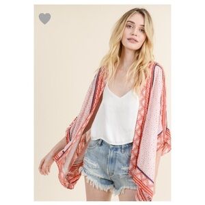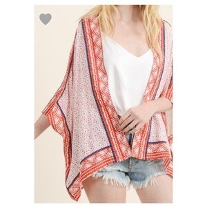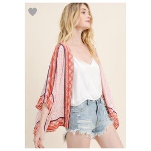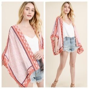 Hues of pink, white, cream, light red/orange and navy are featured in this pretty Kimono that can be worn over just about anything. The colors are very neutral.