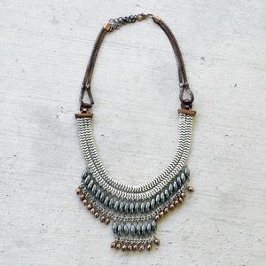 Brave and bold you will be in this bohemian-inspired, tiered necklace. This playful mix of bronze, silver, and hematite toned metals with teardrop beaded accents will light up your t-shirt and jeans or pull together a simple maxi dress.