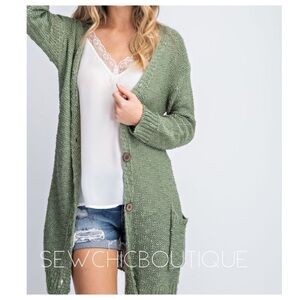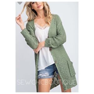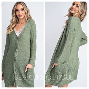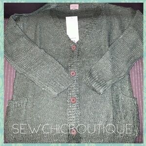 Sea Green Popcorn Texture Yarn Knitted Cardigan (but not a popcorn cardy) just the way it was knitted. It’s gorgeous, for those of you green fans out there like myself. Great color, fabulous quality. Soft like you can’t believe. Long sleeve, big brown button down below the v-neck , 5 big brown buttons finish off this beauty. Big wrap around bucket pockets half front, half back. Love this!!